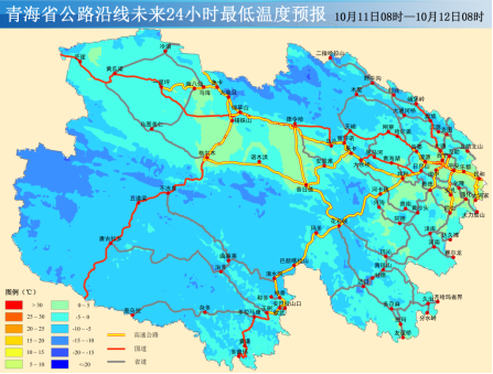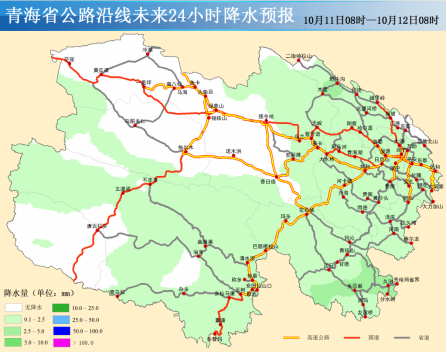 10月11日08时~10月12日08时:今天白天,海西东部、海南、海北大部、果洛、黄南及化隆的部分乡镇有小雨(雪)或雨夹雪(0.1~4毫米),省内其余地区晴或多云;今天夜间,西宁、海东、海南、海北、果洛中南部、黄南及天峻的部分乡镇有小雨(雪)或雨夹雪(0.1~2毫米),省内其余地区晴或多云。