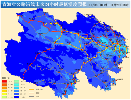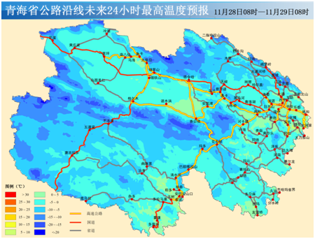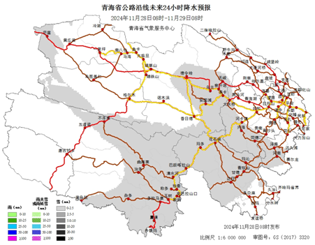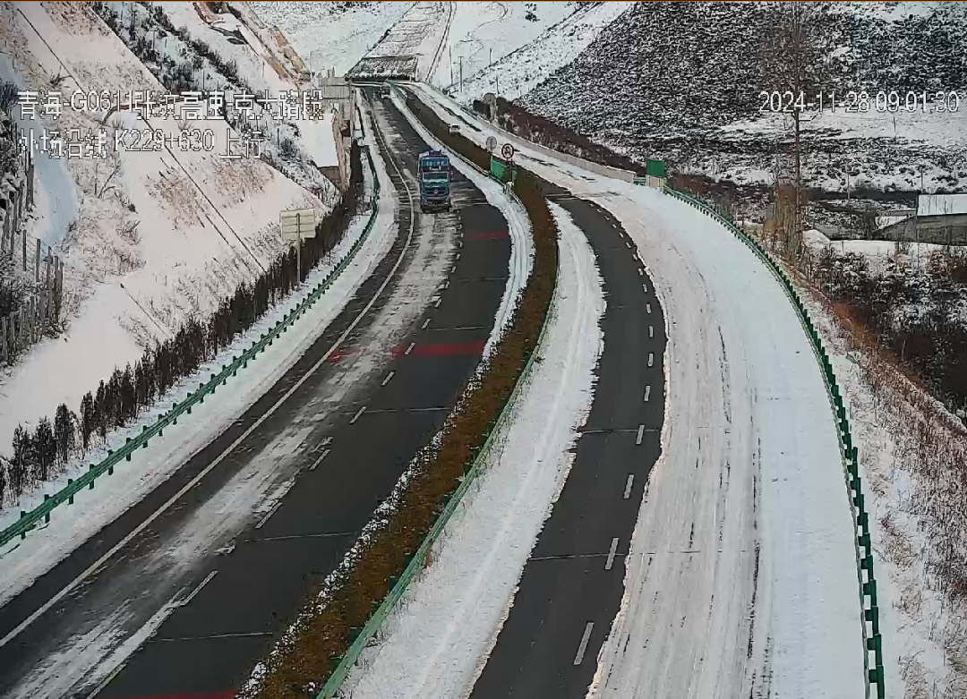路况信息 2024年11月28日 积雪路段 G0611(张掖至汶川)高速公路(扁都口-门源):全线路面有积雪。 G0612(西宁至和田)高速公路(曹家堡西-多巴主线):路面有积雪。 G0612(西宁至和田)高速公路湟西一级(湟源-西海):部分路面有积雪。 交通气象 全省天气形势11月28日08时~11月29日08时:今天白天,玉树大部及茫崖的部分乡镇有小雪(0.1~1.3毫米),省内其余地区晴或多云。今天夜间,海西东部、海南南部、黄南南部、果洛中北部、玉树东部的部分乡镇有小雪(0.1~1.0毫米),省内其余地区晴或多云。 温馨提示 受降雪影响今日省内部分路段路面积雪、结冰,降雪天气导致道路湿滑,能见度低,期间气温低,高海拔地区及阴面路段积雪、结冰现象将加重,尤其下坡路段,大型车辆转弯时注意减速,请驾驶人员采取防滑措施,减速慢行,确保交通安全,并请提前了解交通情况,合理安排出行路线。S101(西宁)高速公路(西宁-互助):路面有积雪。